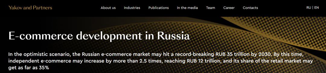 值得期待的是,俄罗斯电商市场规模仍在扩大。根据Yakov and Partners预测,到2030年,俄罗斯电子商务市场规模有望达到创纪录的35万亿卢布(约4294亿美元)。