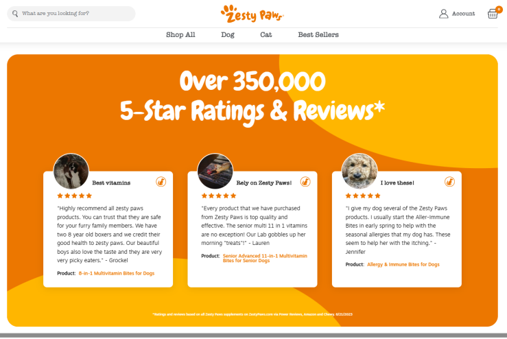 最后,Zesty Paws高度依赖强大的社交证明来建立品牌信任,尤其是在电商平台上。