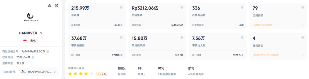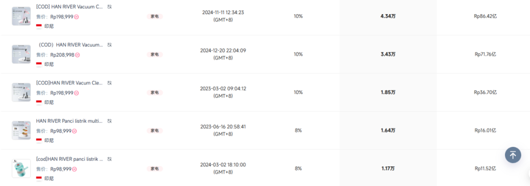 这一策略成效显著。在印尼,HAN RIVER一款无线便携迷你吸尘器通过TikTok售出38.46万单,总销售额突破521.25万美元(约合人民币3714.06万元);在泰国,其多款产品长期稳居家电类目畅销榜,成为家庭必备的热门单品。