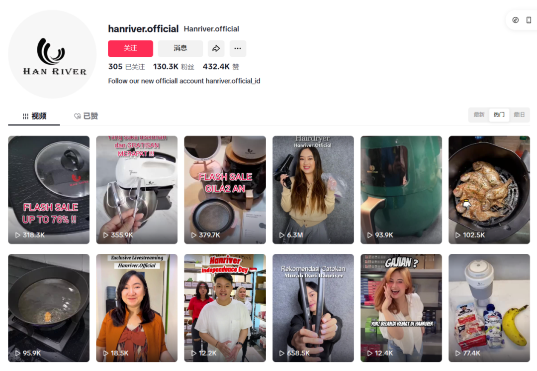 与此同时,HAN RIVER还积极构建 TikTok 多账号矩阵,通过差异化内容精准触达不同用户群体。主账号@hanriver.official 以分享产品使用技巧为主,积累13.03万粉丝;次账号@hanriverlifelive 则侧重直播展示产品性能,吸引8.95万粉丝;专为印尼本地用户设立的@hanriver.official_id 也已积累8.22万粉丝。